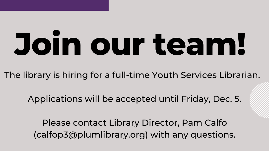 PLEASE EMAIL RESUME AND COVER LETTER TO: Pam Calfo, Library Director: calfop3@plumlibrary.org