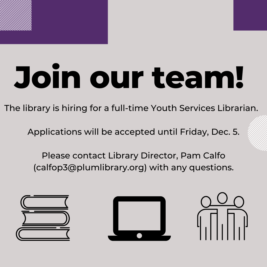 PLEASE EMAIL RESUME AND COVER LETTER TO: Pam Calfo, Library Director: calfop3@plumlibrary.org
